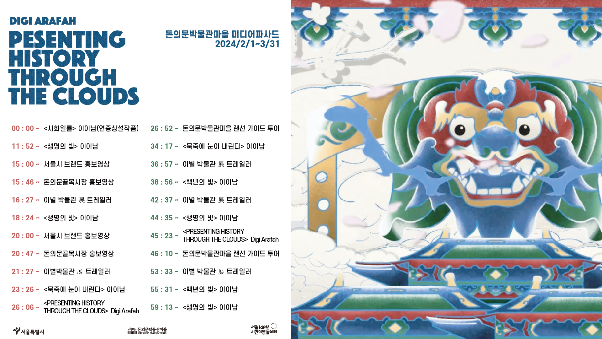 전시 내용 : 청룡의 해를 기념하여 돈의문박물관마을에 봄의 영원성을 바라며 시각적 메시지를 전달합니다. 봄의 부드러운 색상은 긍정적인 분위기를 조성하고 한국의 이상적인 아름다움을 보여주는 미디어아트 전시입니다