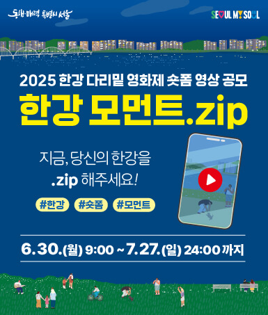 1·2주 차에는 저녁 7시부터 시민이 직접 제작한 ‘한강 모먼트. zip’ 숏폼 영상 공모전 본선작 10편이 상영됩니다. 현장 및 온라인 투표로 참여 가능하며, 현장 투표 인증자에게는 시원한 음료, 참여자 중 추첨으로 경품이 증정됩니다. 3주 차에는 시상식이 열립니다.
