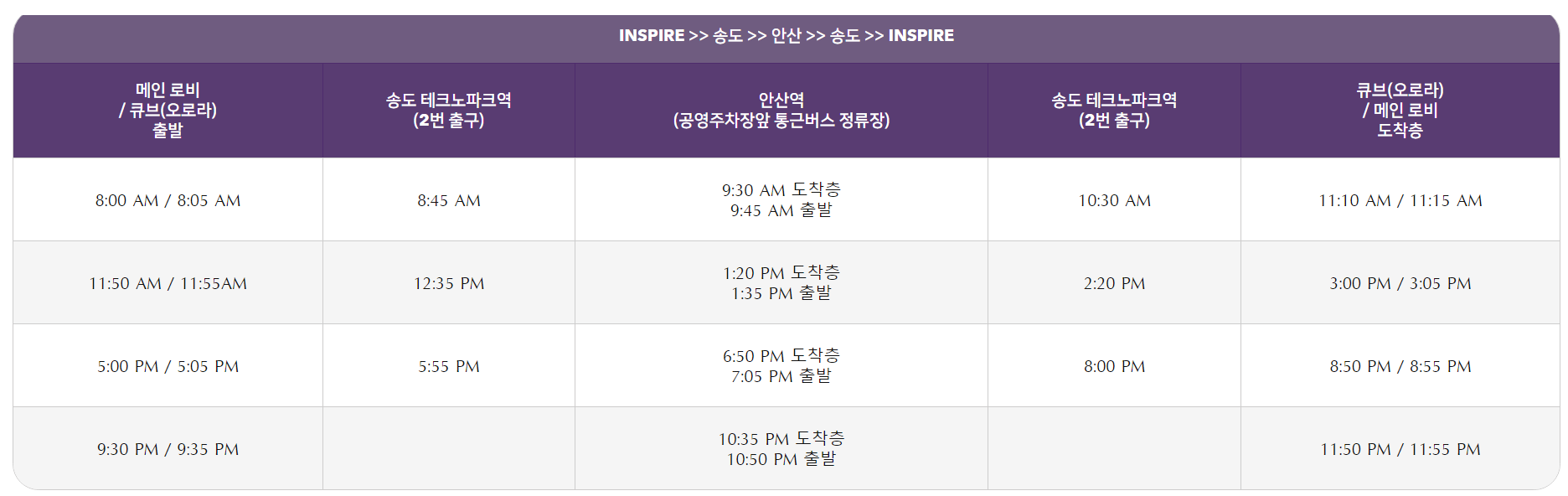 셔틀버스 시간표 (되돌아가는 길 버스 배차 간격이 있으니 시간 확인 후 일정 계획하시길 추천합니다.)