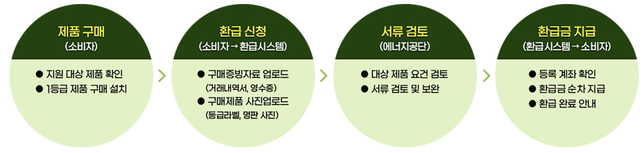 • 이후 환급 신청 시 준비해야 할 서류는 에너지효율 라벨 사진, 제조번호가 기재된 명판 사진, 거래내역서 또는 영수증 등입니다. 신청자 명의의 환급 계좌 정보도 정확히 기재해야 하며 자세한 제출서류는 으뜸효율 홈페이지에서 확인 가능합니다.